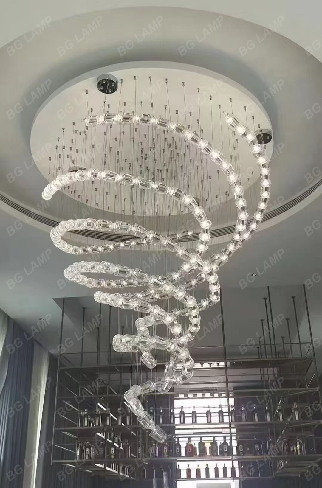 This chandelier is a striking display of artistry and light, featuring a cascading composition of golden and crystal loops suspended in midair. Each ring reflects and refracts the light beautifully, creating a dynamic play of brilliance and depth. The design combines modern geometry with luxurious materials, offering a statement piece that feels both bold and sophisticated. Perfect for high ceilings and grand spaces, it transforms any interior into an atmosphere of refined elegance.